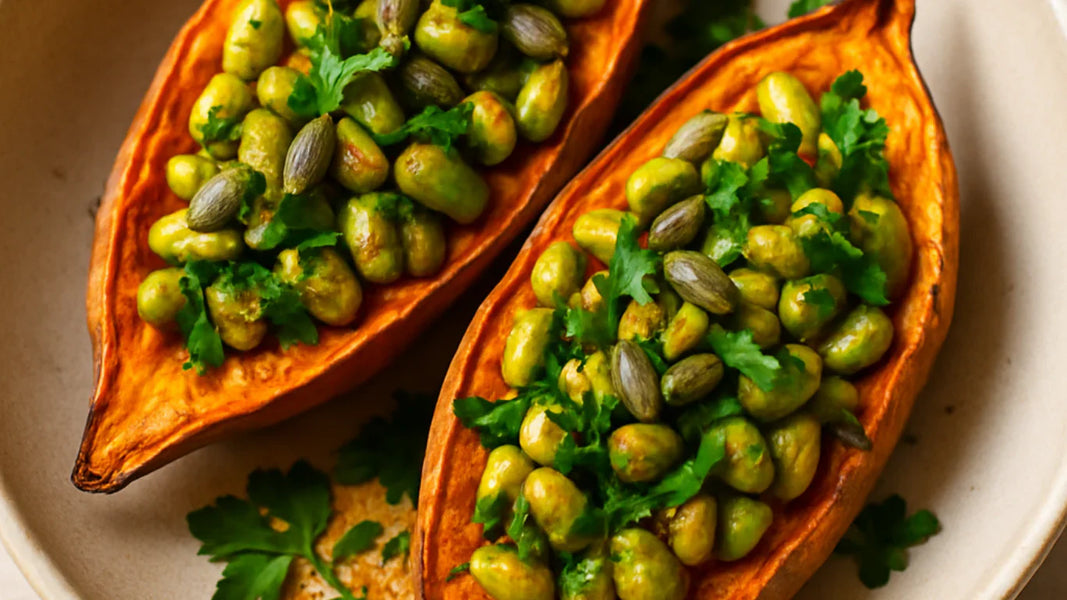 A nourishing and easy lunch dish with baked sweet potatoes, spiced edamame beans, and crunchy seeds. Rich...